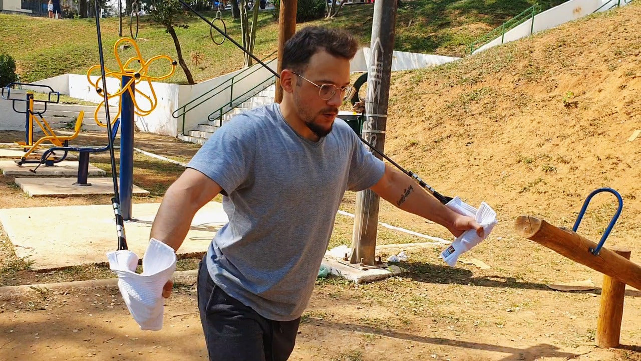 Utilização com elástico: Enrolar o elástico em torno de um poste ou na moldura de uma porta e começar a executar o Golpe compatível com seu conhecimento. As duas extremidades do elástico representam a lapela dos seus adversários. Lembre-se de dobrar os joelhos, manter as costas retas e puxar a Gola constantemente.